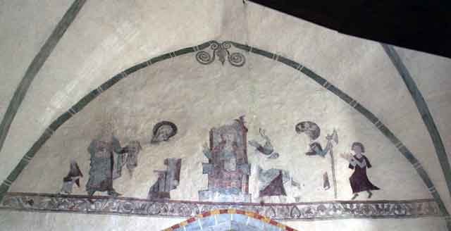 | Kalkmålningen i triumfbågen från 1300-talet föreställer Kristus som världshärskare omgiven av Maria och Johannes Döparen, s:t Barthlomeus och S:t Olof. De två mindre gestalter längst ute är formodligen donatorn och hans hustru. | 2005-05-01 20:26 |
