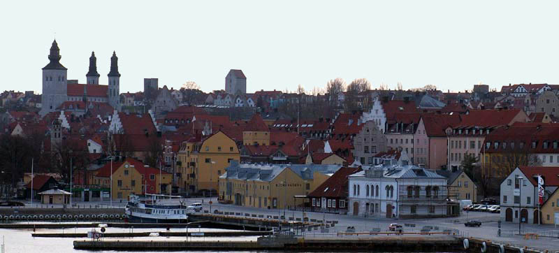 | Om jag skall beskriva lite av vad du ser på bilden har du Visby Domkyrka S:ta Maria med de 3 tornen till vänster, nästa torn är Norderport och sedan kommer Dalmanstornet, det torn som precis tittar över taken längst till höger är Österport. Du ser även en del av packhusen på Strandgatan och en hel del av husen på klinten. Nere längs kajen har du det stora gula packhus mitt i bilden, numera är det Baltic Art Centre. Det lilla röda huset bredvid var tidigare en populär kaffestuga när man kom med färjan tidigt på morgonen, numera är det en vanlig krog. Den vita byggnaden med ställningen är den gamla tullbod, i dag Gotlands Tonsättarskola. Båten som ligger inne i hörnan är en restaurang. |